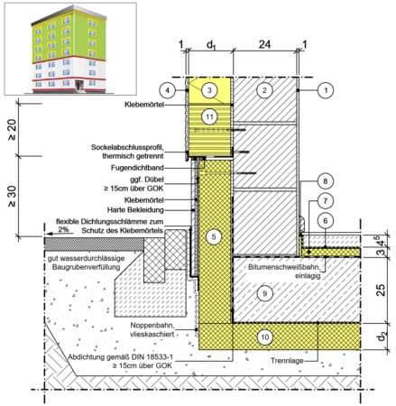 BR-Flachgründung, nicht unterkellertes Gebäude, Sockel mit großformatiger Fliesenbekleidung, erhöhte Bewitterung, mit Brandriegel